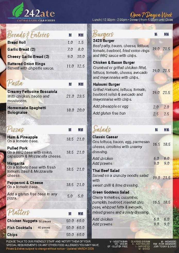 242ate Cafe Bar & Grill is Club Forster's main family-friendly, reasonably priced dining option. We invite you to savour our wide ranging menu where the treasures of the land and sea become fine cuisine!